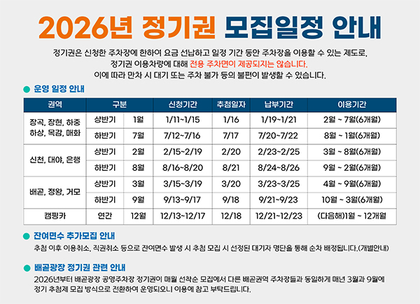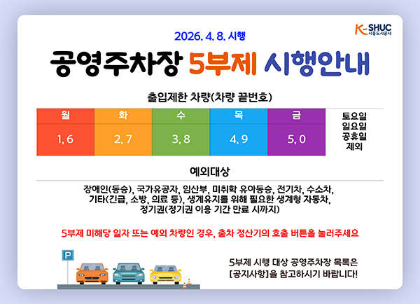 공지사항 공지사항 MTV P16 공영주차장 정기권 추첨 모집 안내 2026-04-08 시흥도시공사 공영주차장 차량 5부제 시행 안내 2026-04-06 [캠핑카(배곧13)] 공영주차장 정기권 잔여면수 추첨 결과 안내 2026-03-20 [배곧/정왕/거모권] 2026년 상반기 월정기권 추첨 결과 안내 2026-03-20 더보기